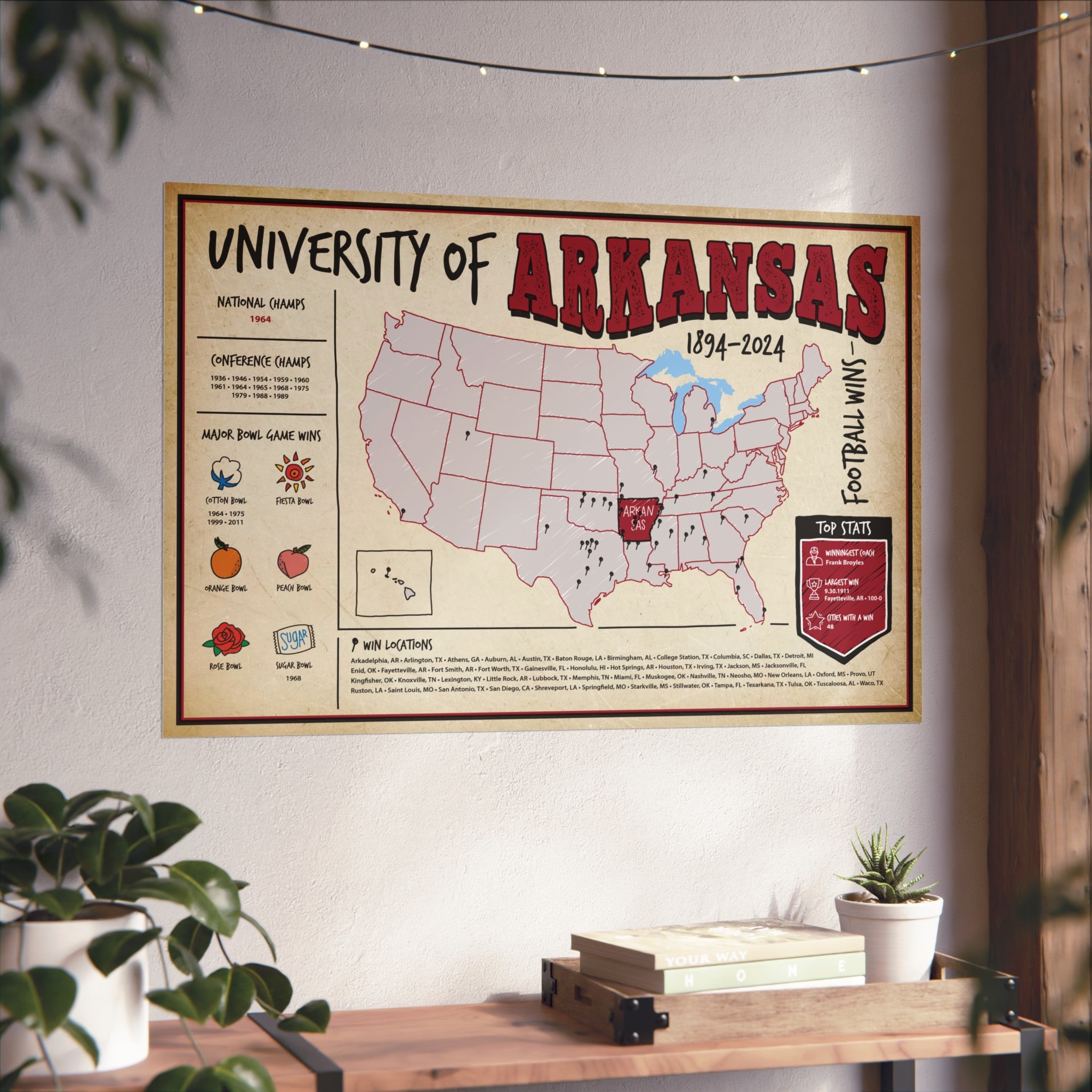 Our Wall Posters feature historical data, including a list of National Championships, Conference Championships, New Year's Six Bowl Games, your winningest coach, and your most significant blowout win. Perfect for fan caves, offices, and alumni walls — our maps make unforgettable gifts for students, grads, and lifelong fans.