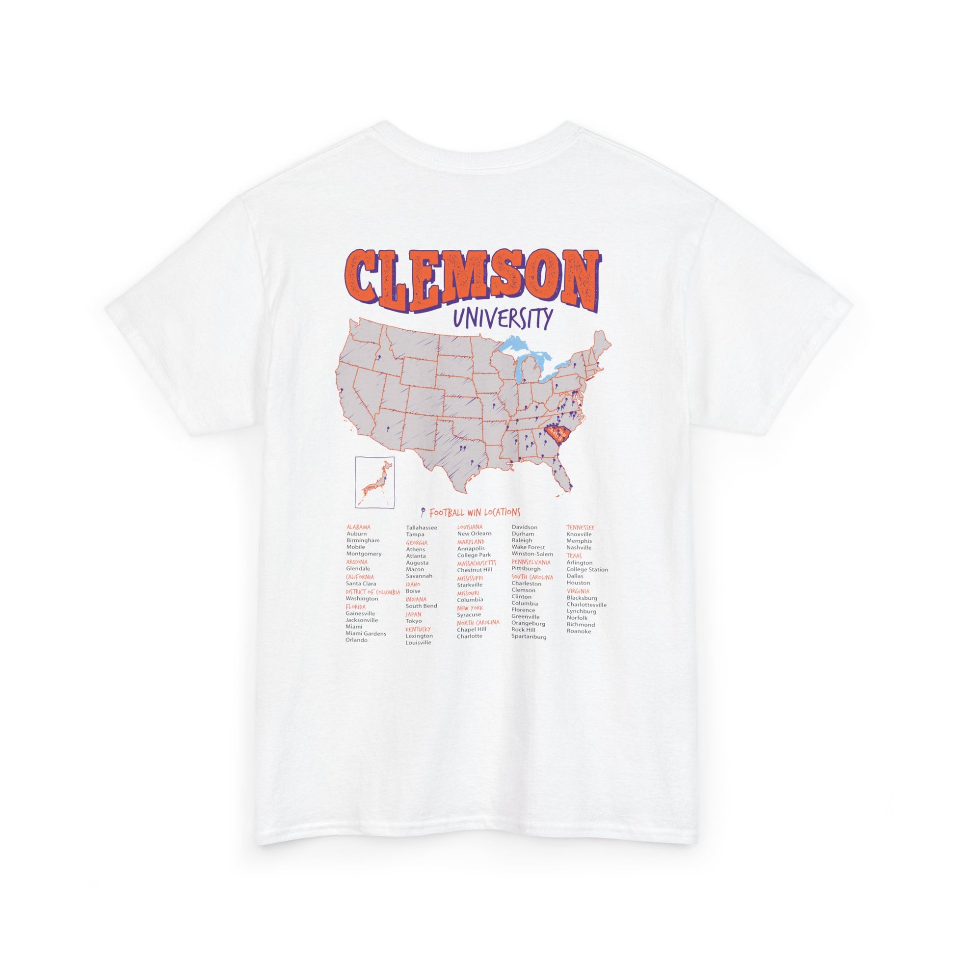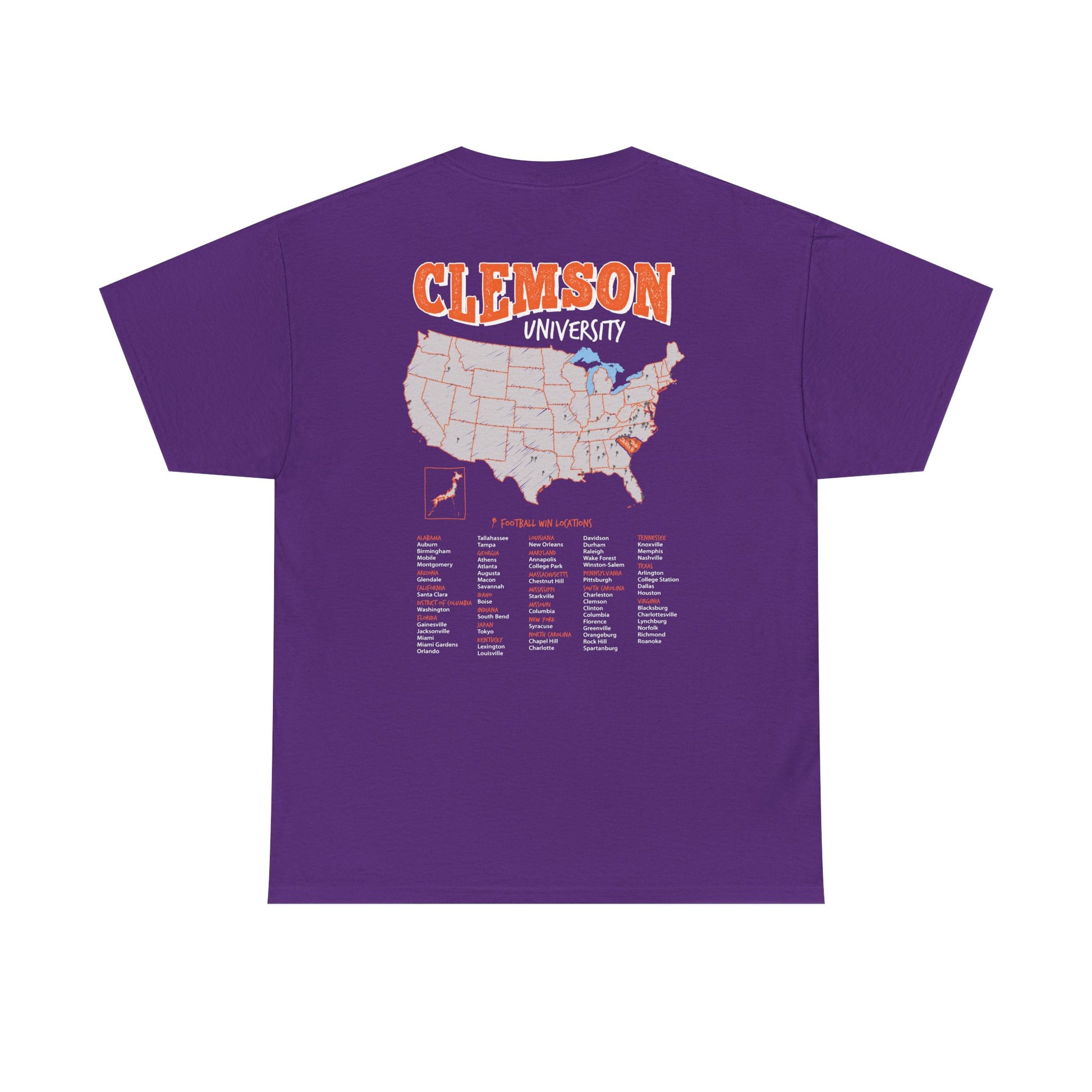 Our Victory Map T-Shirts bring generations of triumph to life, featuring a detailed map of every city where your team has won—from legendary rivalries to unforgettable bowl games.