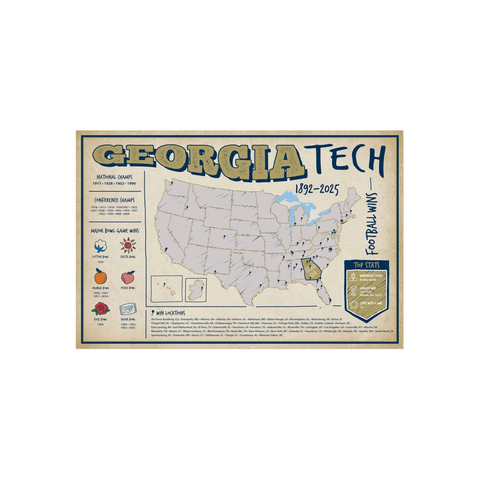 This map of Yellow Jacket football dominance makes an unforgettable gift for holidays, birthdays, or graduation.