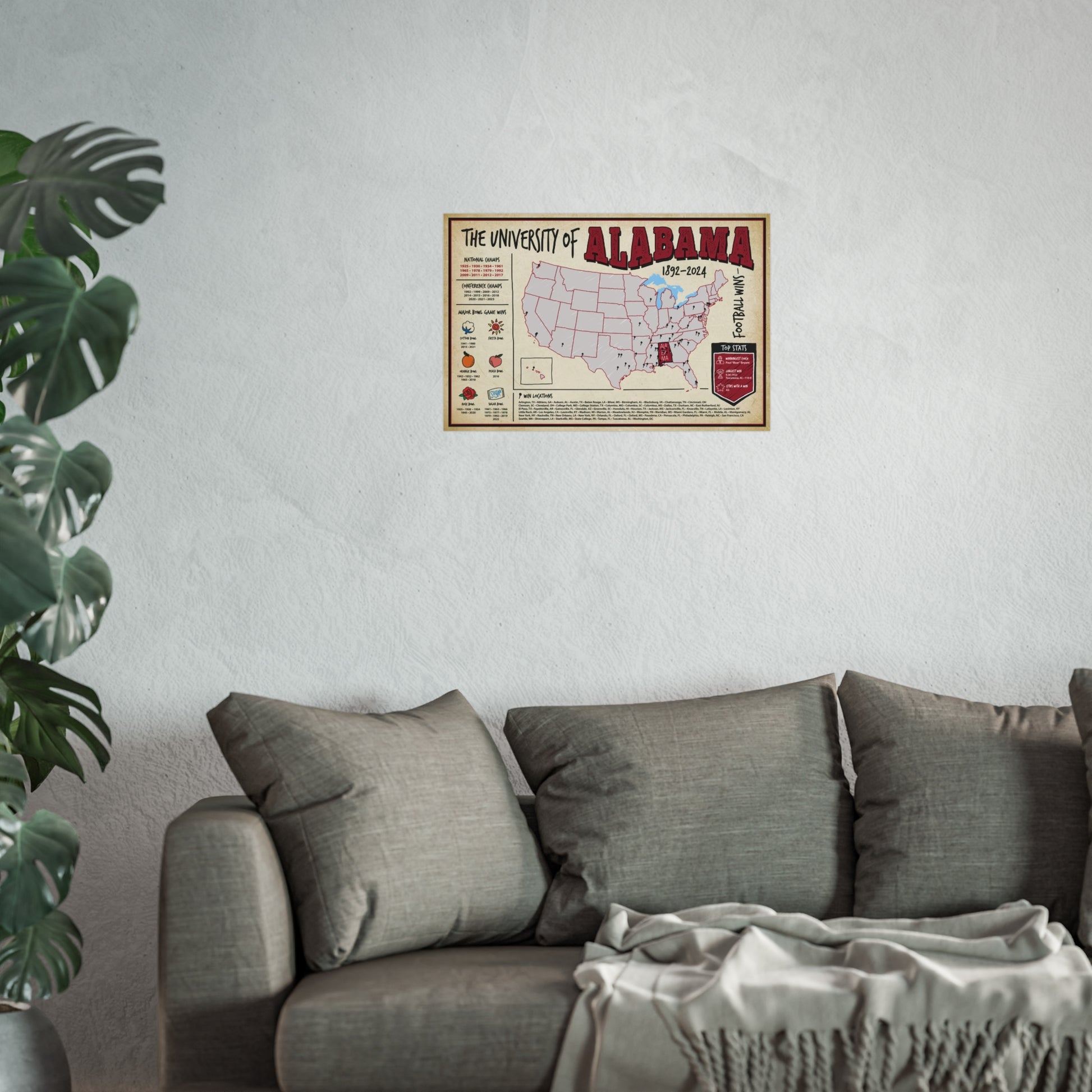This map of Crimson Tide football dominance makes an unforgettable gift for holidays, birthdays, or graduation.