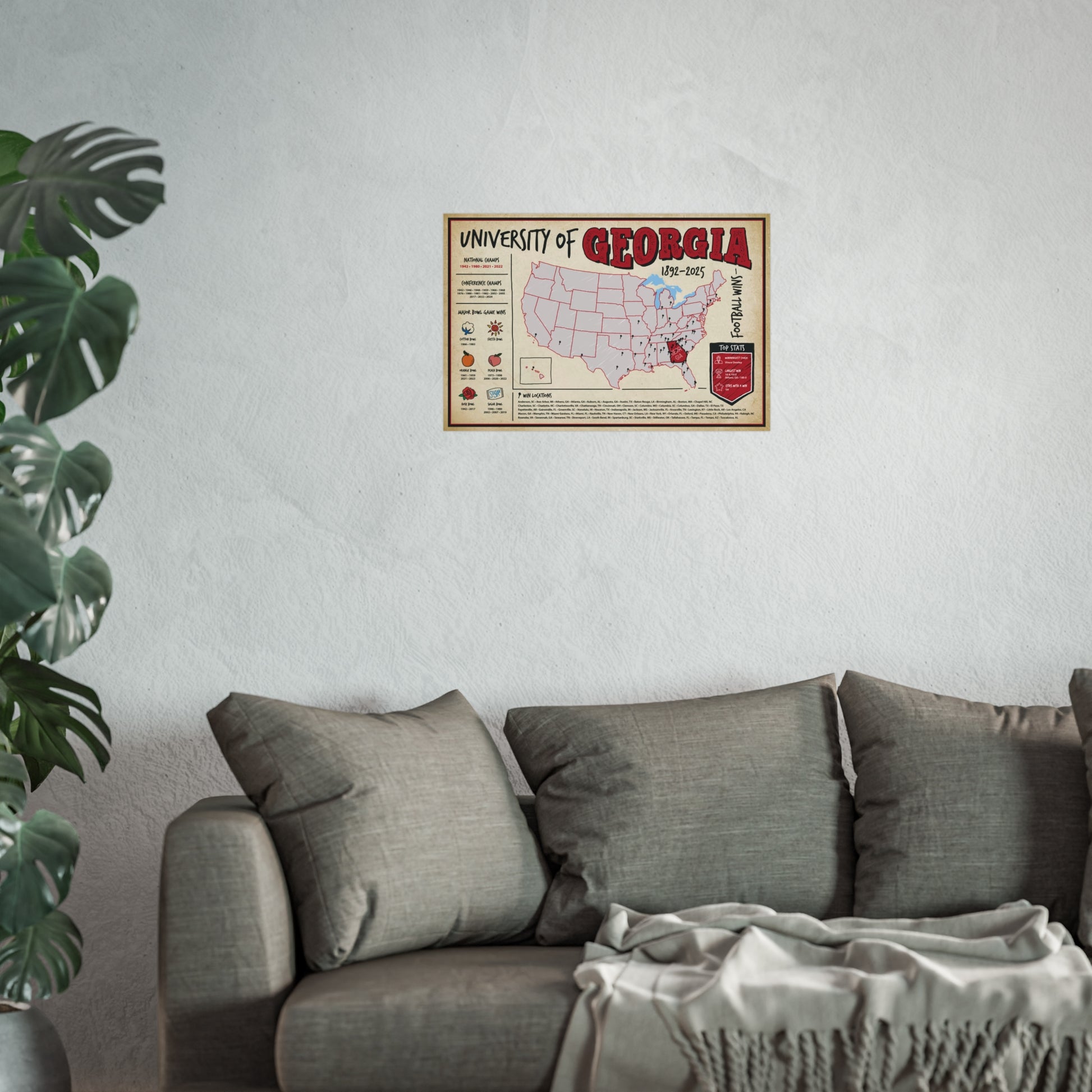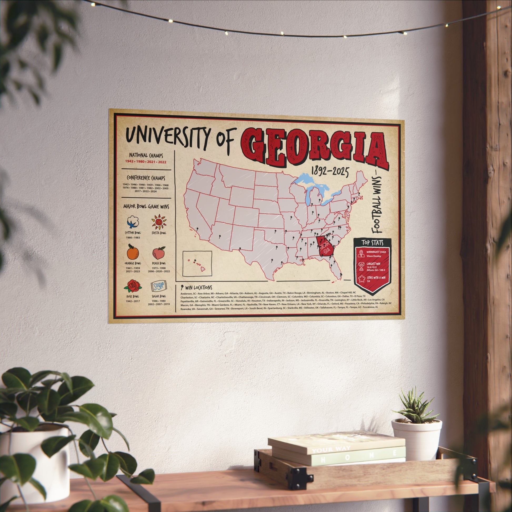 Honor Georgia’s championship pedigree in one stunning print. This Epoch Wins wall poster pinpoints every city where the Bulldogs have earned a win, from early rivalry clashes to modern playoff glory, creating a clean visual timeline of UGA dominance.