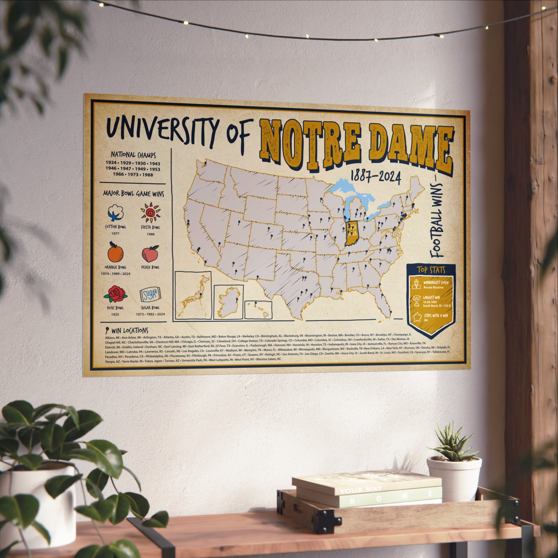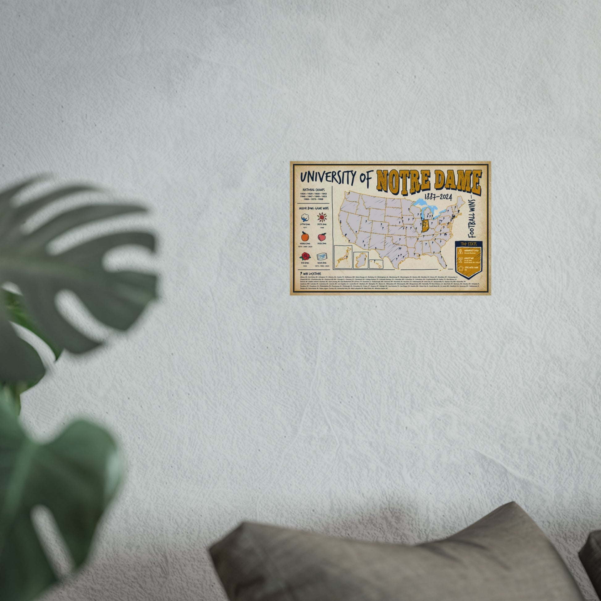 Honor Notre Dame’s storied football tradition with a map worthy of the legends. This Epoch Wins wall poster plots every city where the Irish have won, spanning rivalries, bowl games, and marquee matchups to create a refined, history-rich centerpiece for your wall.