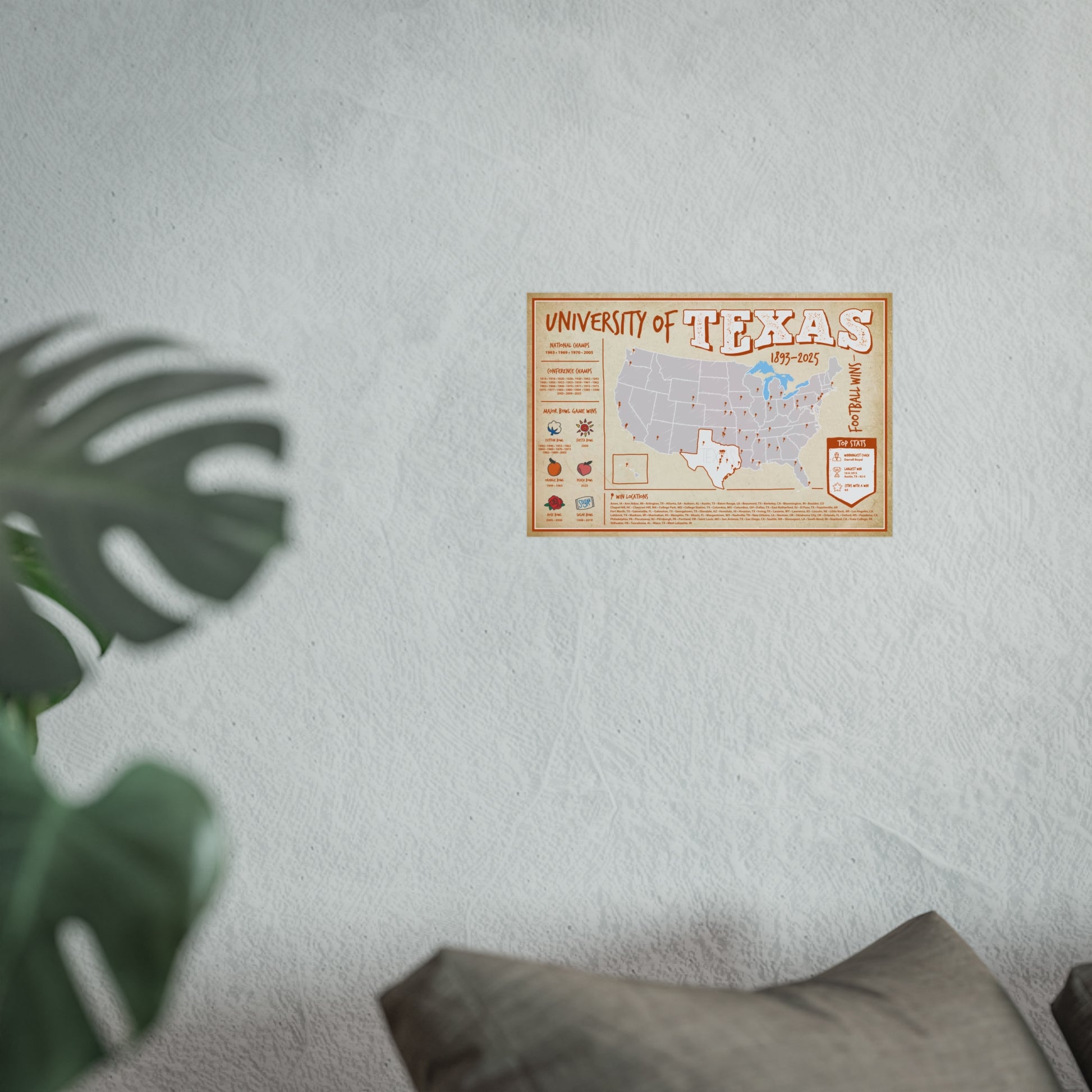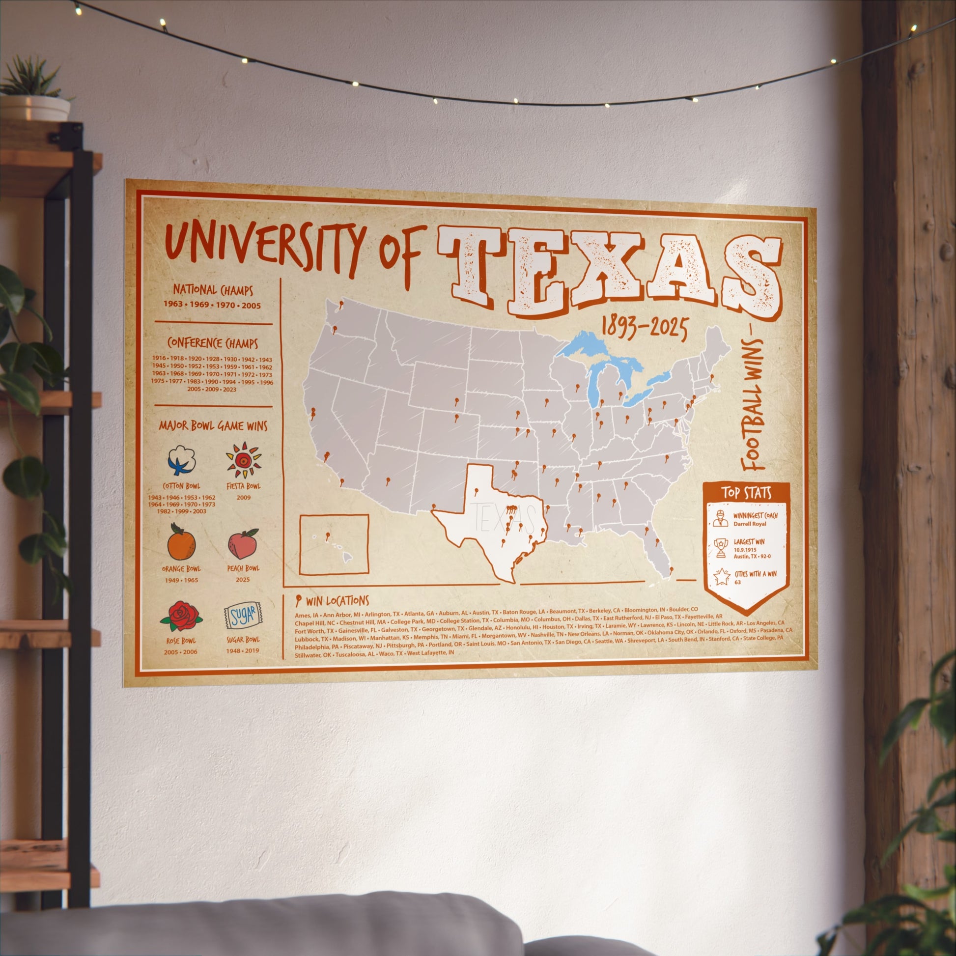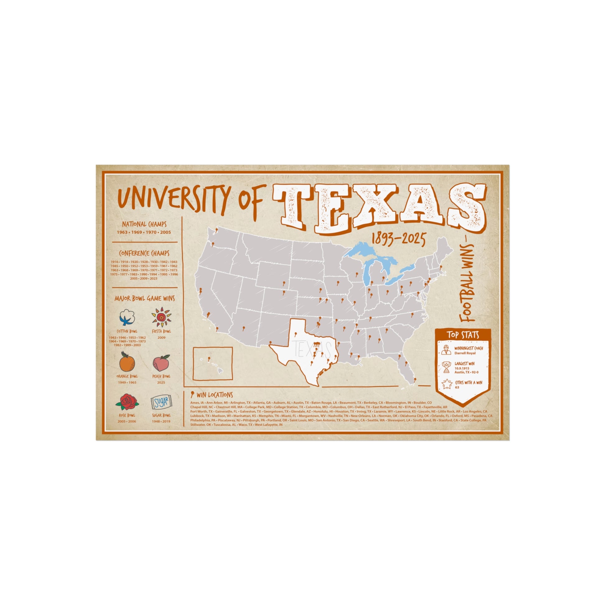 Celebrate Texas football's impact across the country. This Epoch Wins wall poster pinpoints every city where the Longhorns have notched a win, connecting legendary games, rivalries, and bowl appearances into a polished map that's all about burnt orange pride.